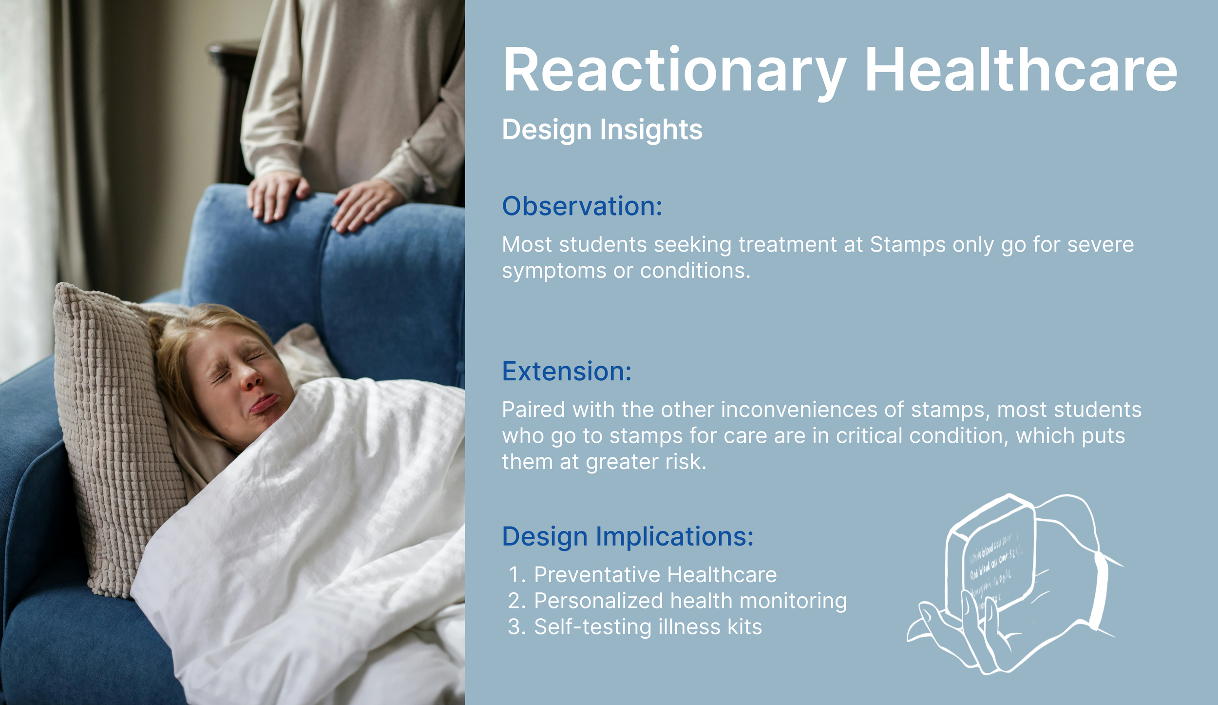 The current way that healthcare on Georgia Tech’s campus is done is ineffective for the students at large. Many of the students that we poled and interviewed expressed problems that they faced that deterred them from even seeking out care in the first place. This project explored ways in which students could take a more proactive approach to their healthcare, wherein getting the healthcare that they needed worked within their busy schedules rather than against.